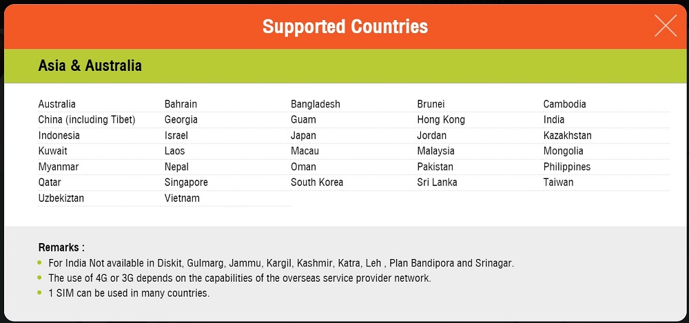 >SIM カードが有効化されると、指定された国 (購入したパッケージに記載されている国) で 60 日以内に使用する必要があります。リストされた国で 60 日以内にサービスを使用しない場合、ローミング パッケージは無効になり、パッケージを再購入する必要があります。