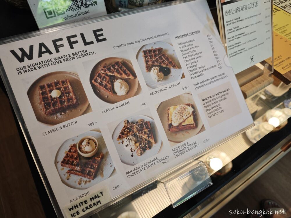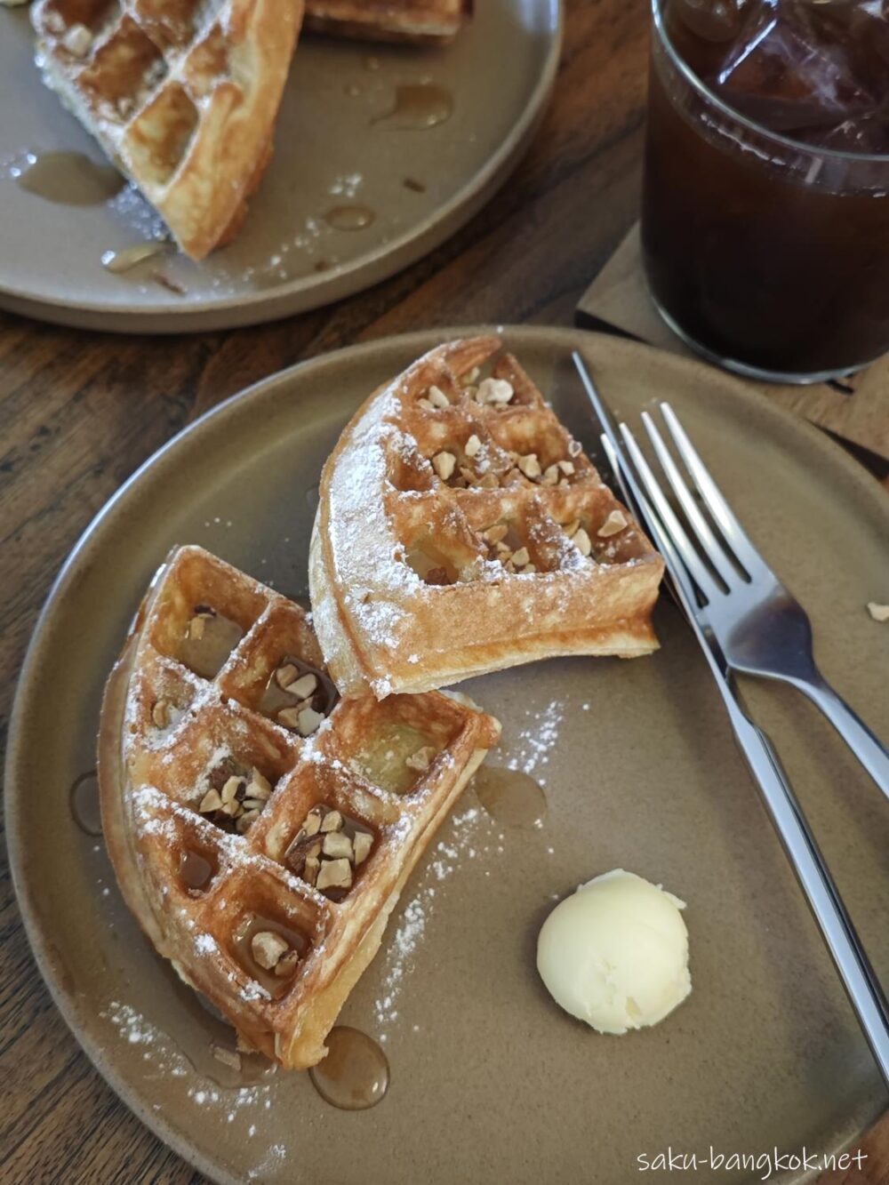 注文したのはアイスブラックコーヒー(THB 110)とクラッシック&バターワッフル(THB 195)。