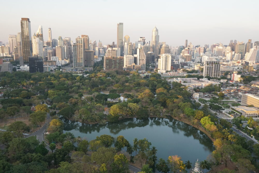 目の前に広がるルンピニ公園の広大な緑の奥に、バンコク都心のビル群を望む最高の景色。