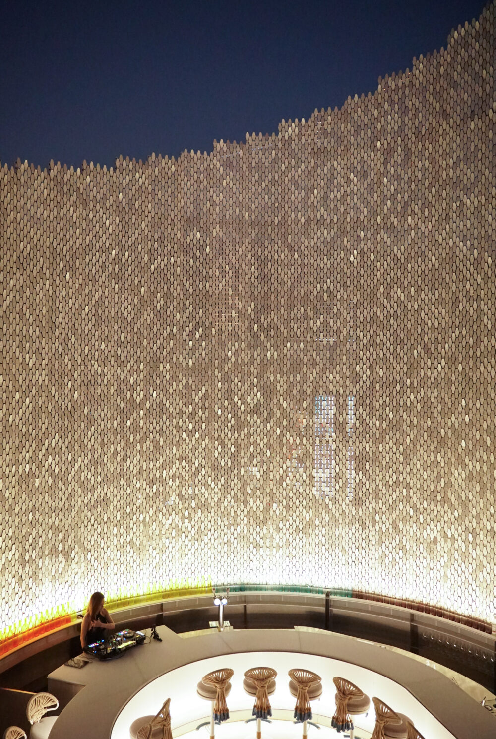 バーカウンター&DJエリアの背景部分は、暗くなるとキラキラ煌めきます。