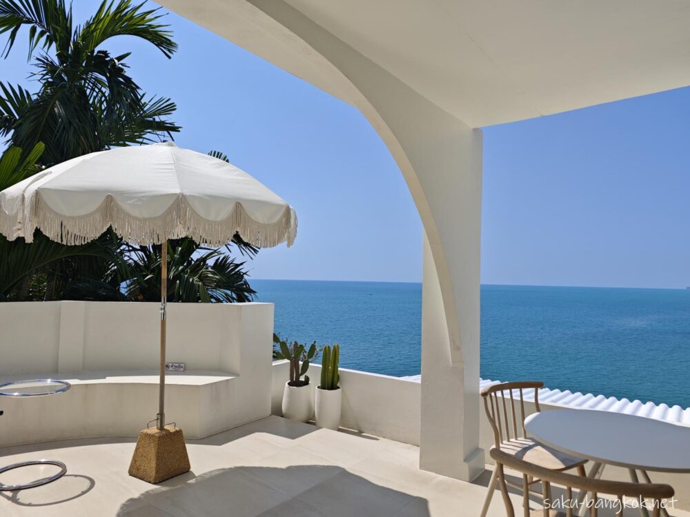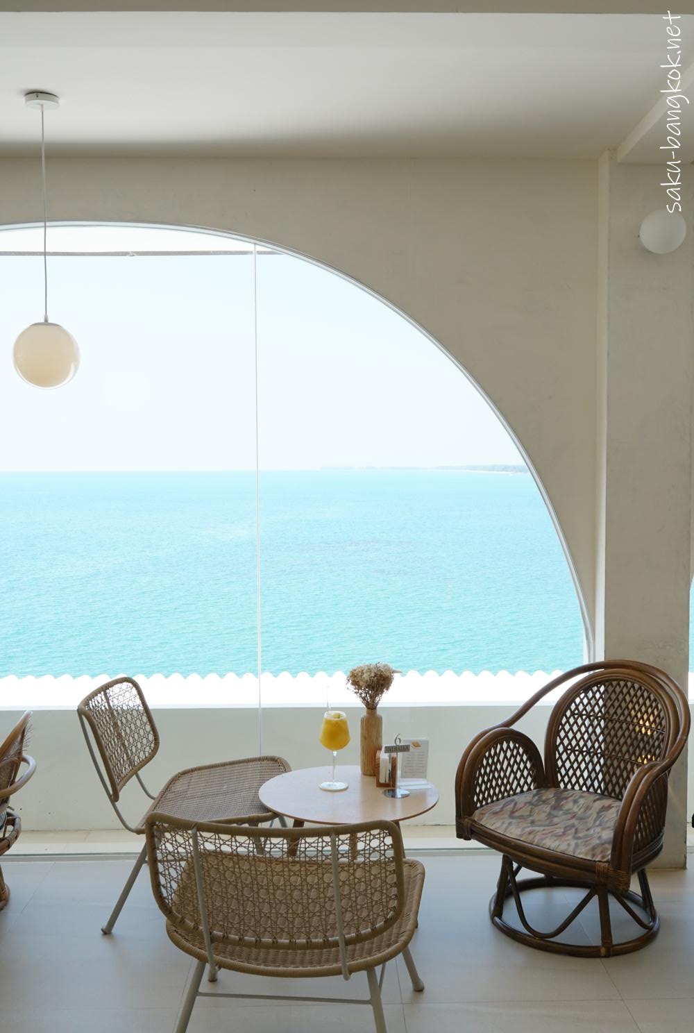 海の青とカフェの白が相まって、最高の景色が楽しめます。