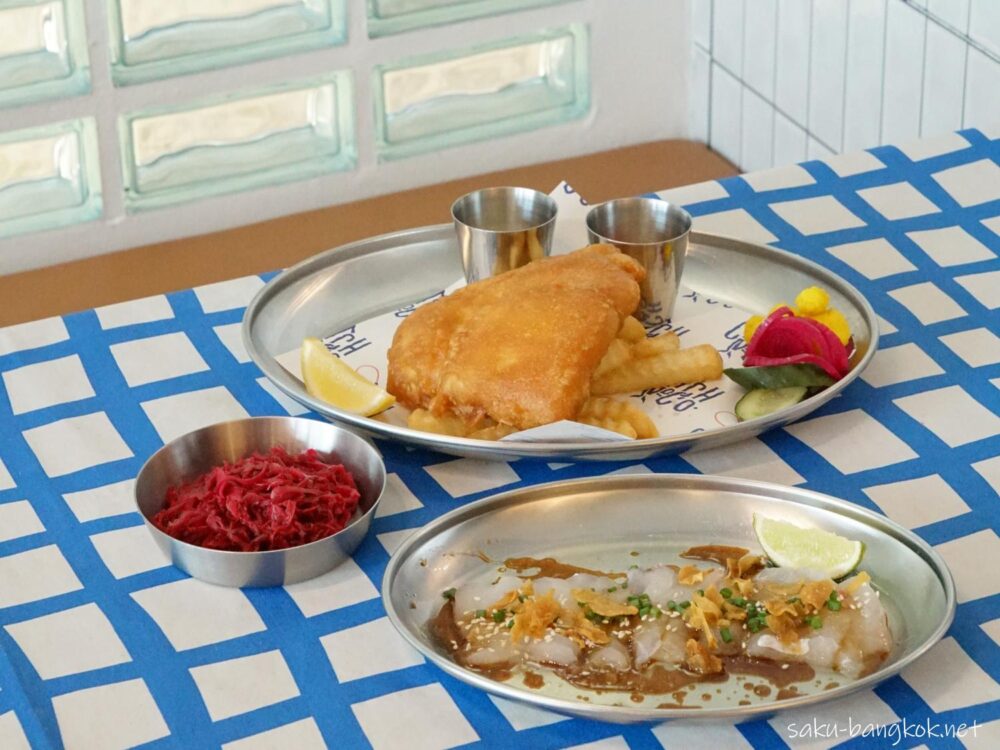 季節の魚のフィッシュ&チップス THB 250, ザワークラウト THB 70, 季節の魚の刺身(ホームメイドドレッシング) THB 230