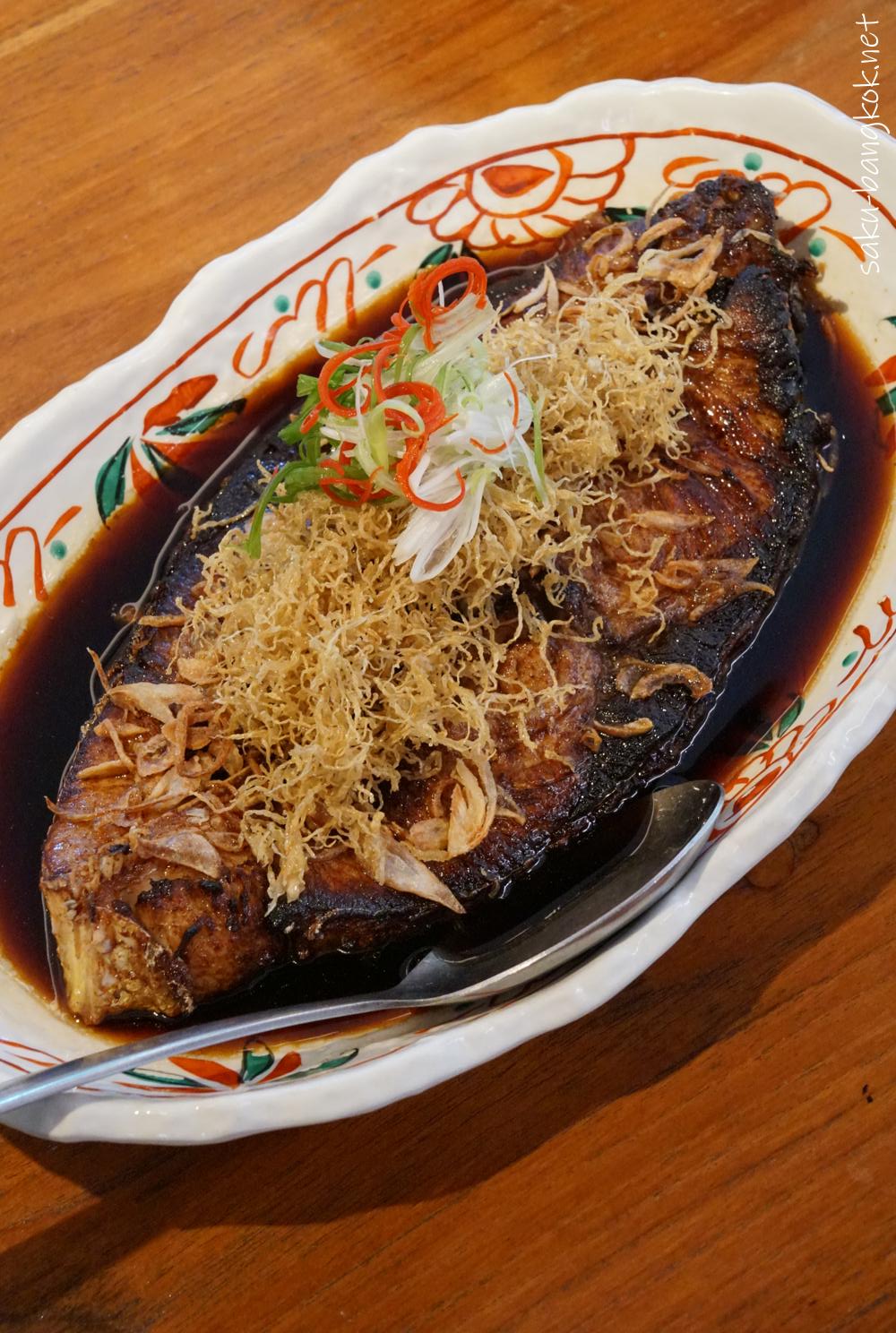 プラートートシーユー:魚を醤油で煮付けたもの、臭みなく香ばしい醤油味で美味しい