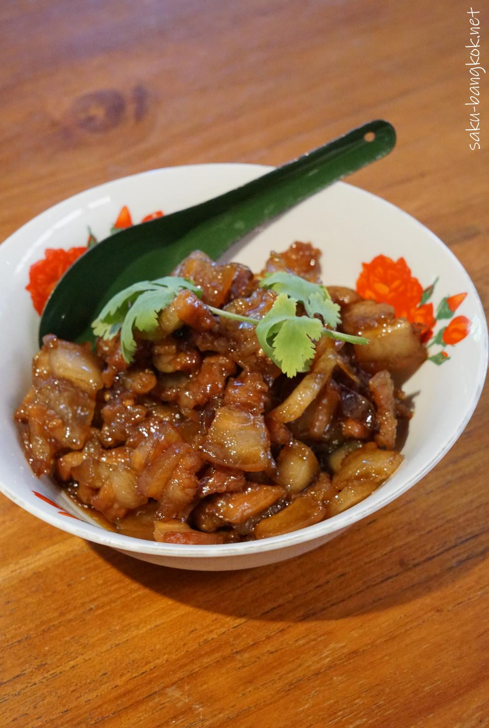 ムーワーン:豚肉をパームシュガーや醤油で甘辛く煮込んだ料理、ごはん泥棒