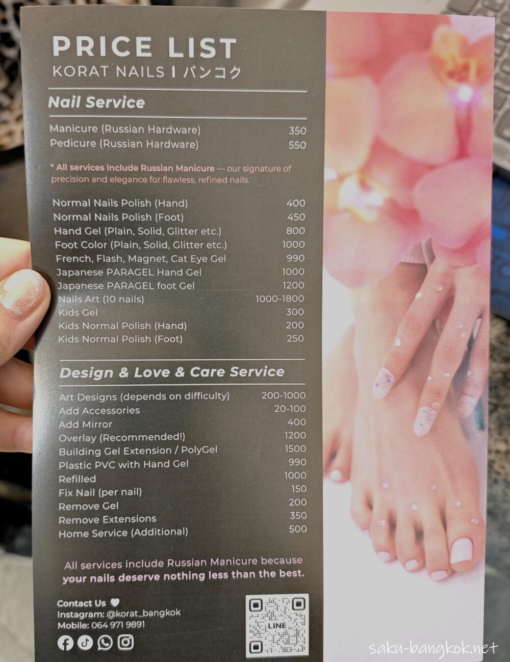 KORAT Nails Bangkokのメニューは画像をご参照ください。