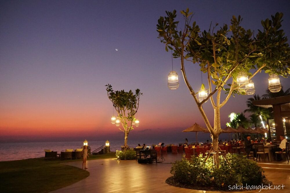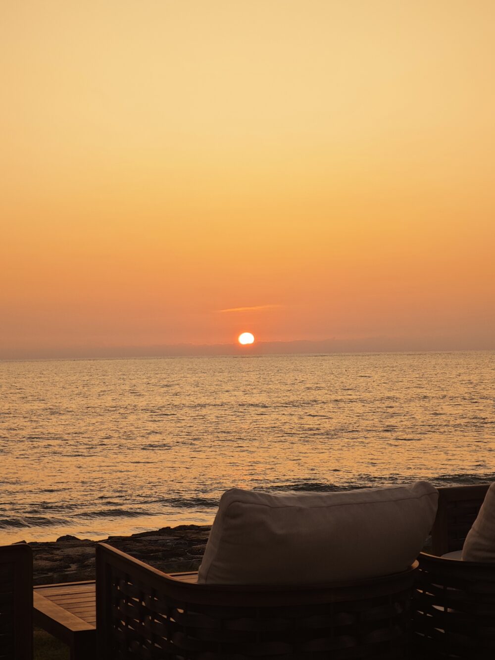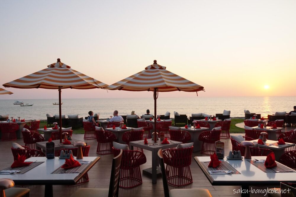 リゾートの目の前にはまっすぐな広いビーチが広がっていて開放感抜群。朝の穏やかな青い海も、夕日に染まる海も、どちらも美しい。
