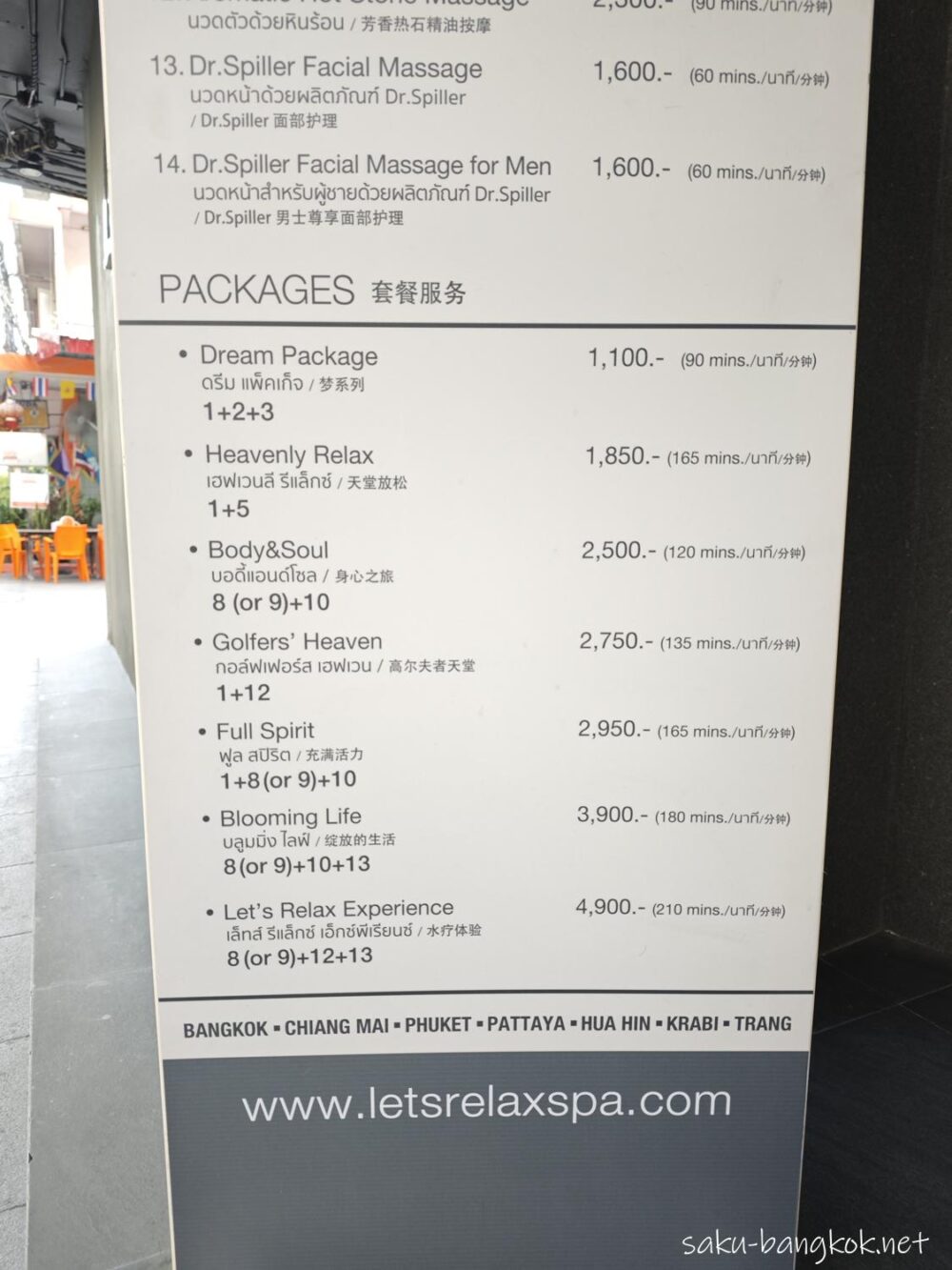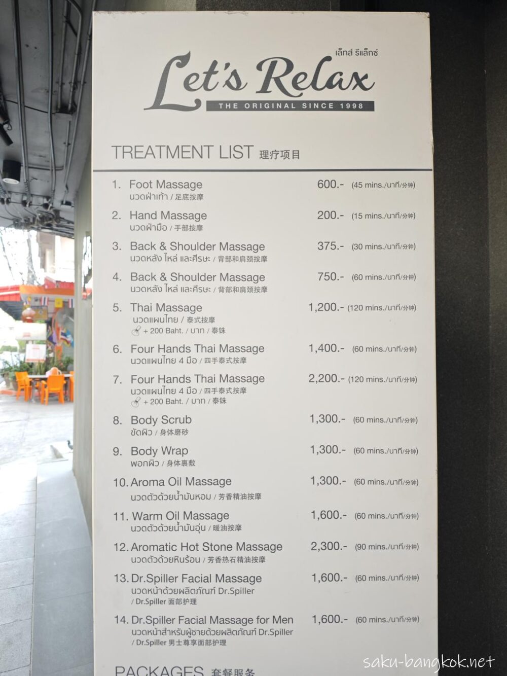 Let’s Relax Spa Sukhumvit 14店のメニューはこんな感じです。