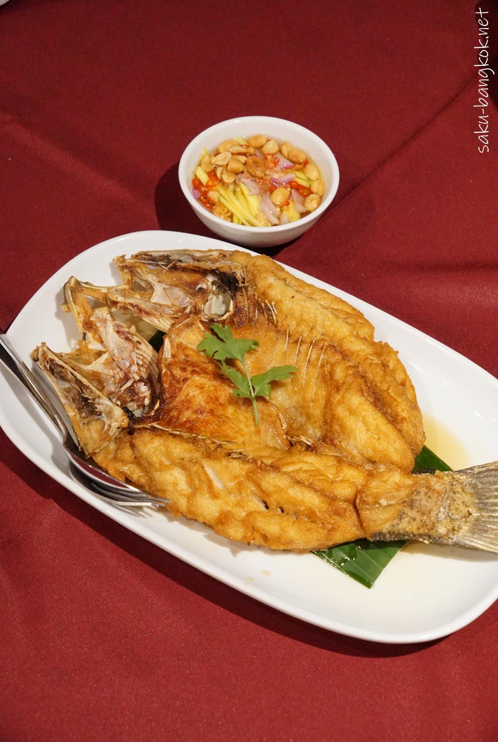 大好物のマンゴーサルサソースで食べるシーバスの姿揚げ THB 450