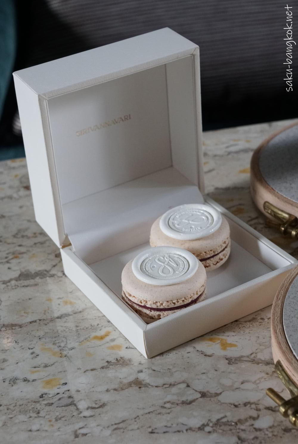これに加えて、シリワンナワリ王女が手掛けるブランドSIRIVANNAVARIのロゴが書かれたマカロン。カシス味のクリームが入っていて美味。