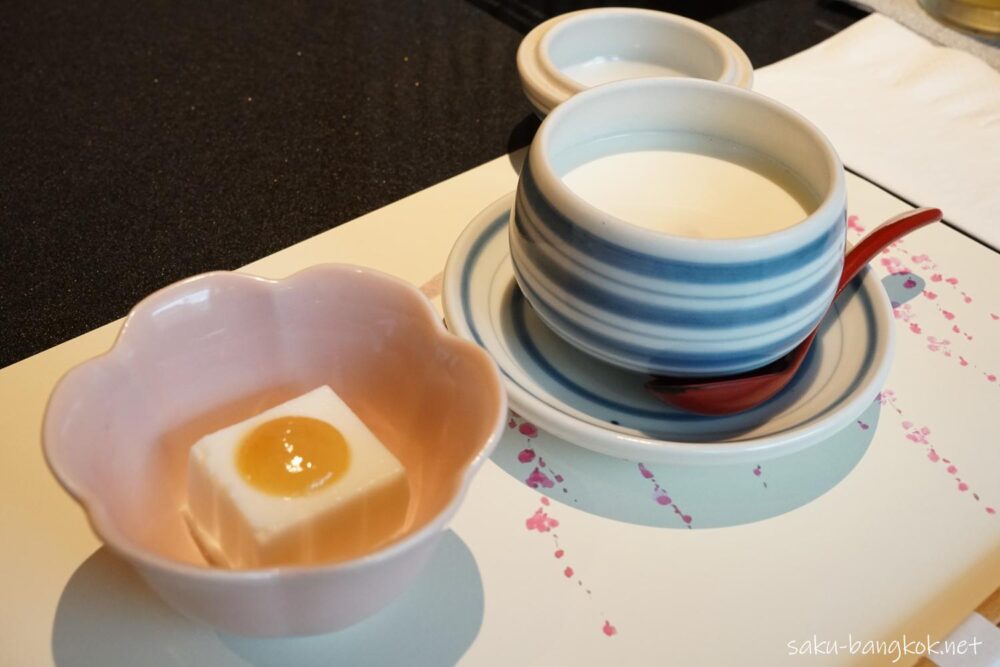 まず最初に提供されたのは、もちもち食感にコクのある嶺岡豆腐と、やさしい味のお出汁が美味しい茶碗蒸しのような一品。