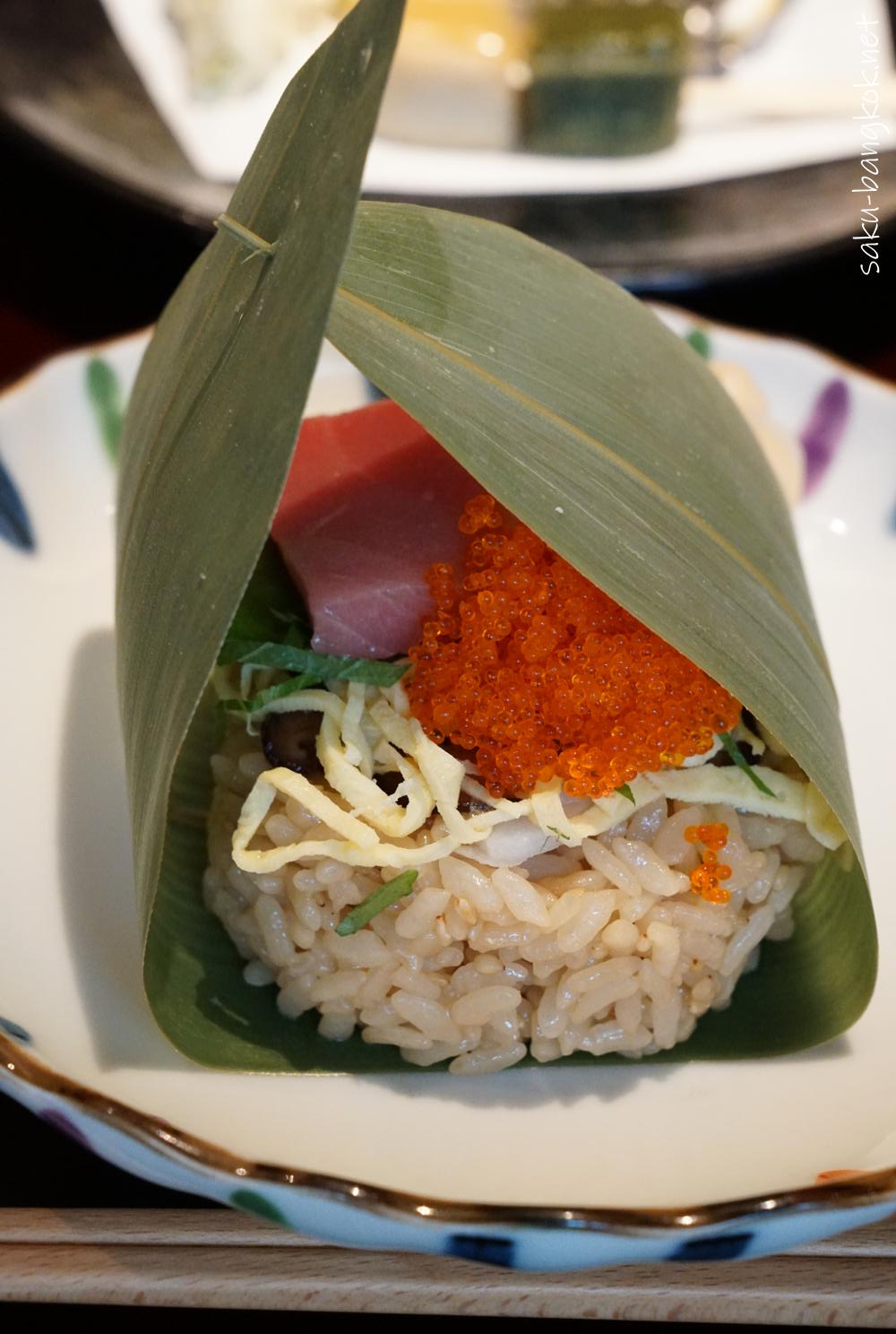 メインはミニ散らし寿司で、笹の葉に包まれて提供されました。以前は手毬寿司だったものが変更になったそうです。