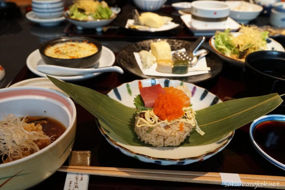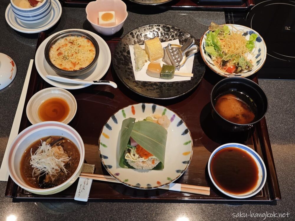 今回私がいただいたのは華ランチ(THB 550++)、ミニ散らし寿司と豆腐料理のセットです。