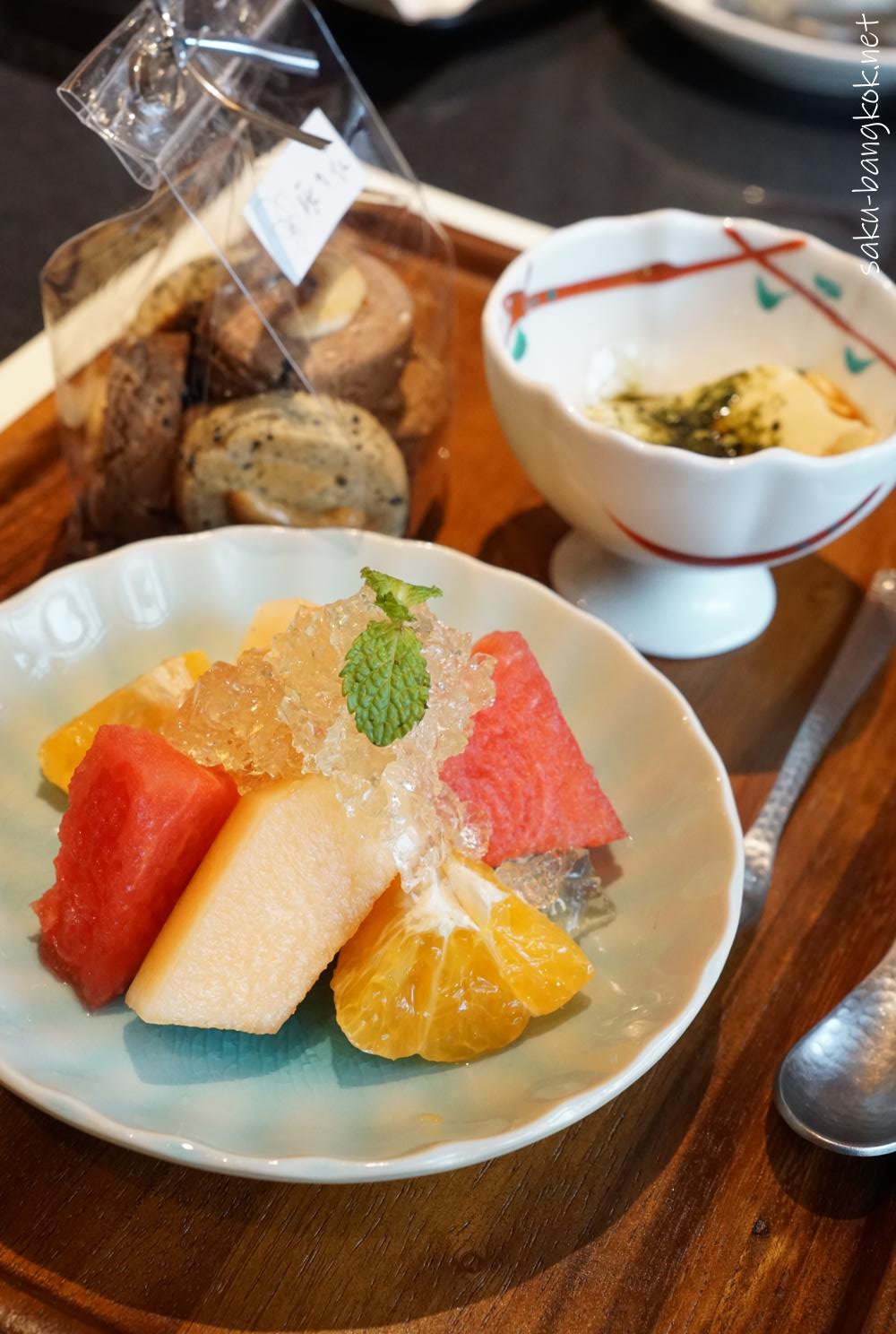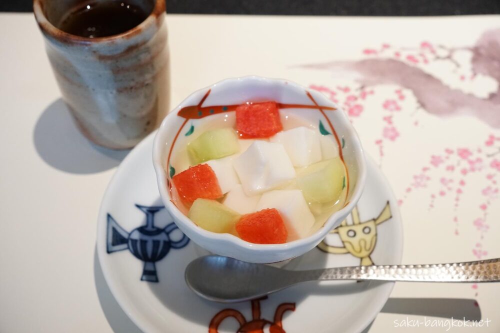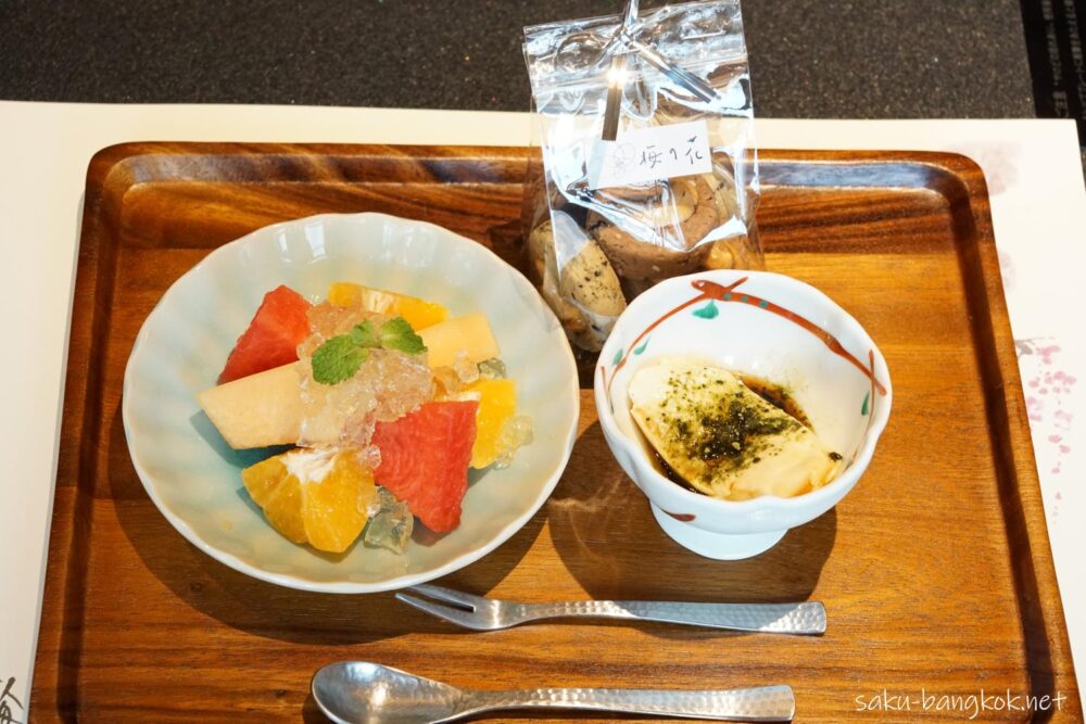 蜂蜜ジュレがかかったフルーツ盛り合わせと、黒蜜が美味しいお豆腐デザートです。