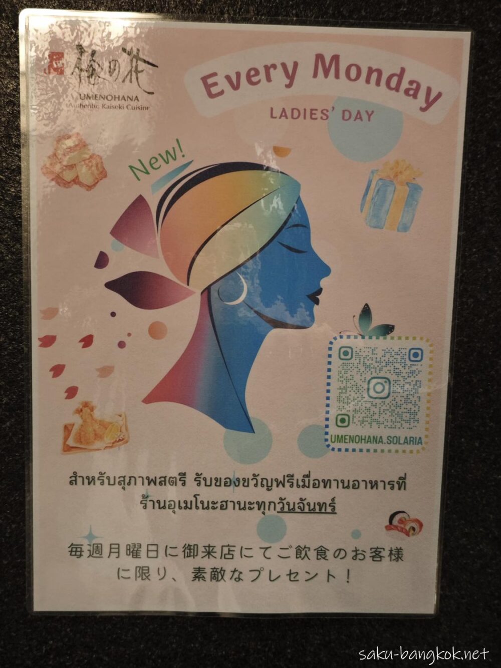 梅の花では、毎週月曜日がレディースデーとなっており、女性は素敵なプレゼントがもらえます!